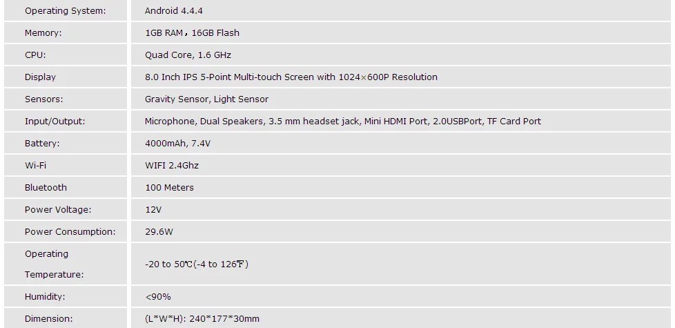 Display: 8.0 Inch IPS 5-Point Multi-Touch Screen With 1024X600P Resolution